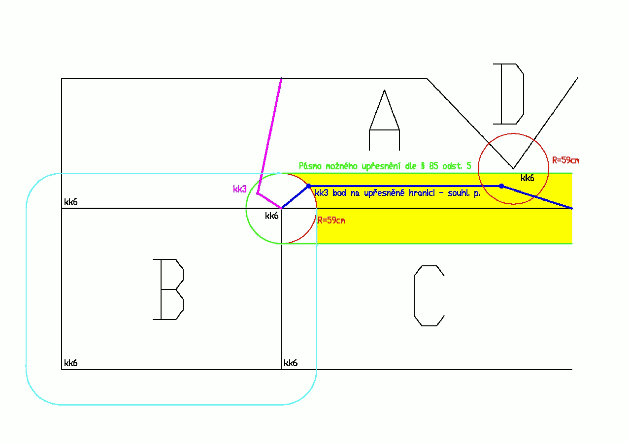 upřesněný průběh hranice mezi parcelami A a C nám ale KP vrátilo GP s