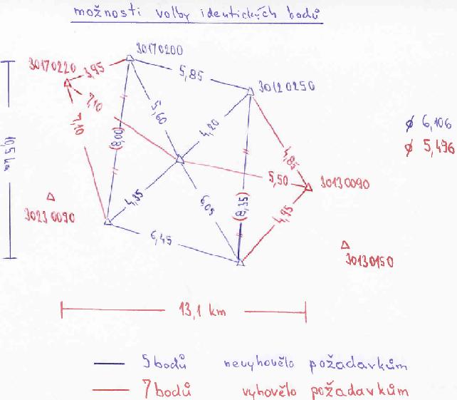 o průměrné vzdálenosti hovořil poměrně obsáhle Ing. Taraba na nedávných školeních pro potvrzovatele GP. V příloze posílám obrázek, ze kterého je výpočet průměrné vzdálenosti patrný. V podstatě z něj vyplývá, že pokud nevychází průměrná vzdálenost z nejbližších bodů, je třeba přidat body další - ale toto vše z obrázku vyplývá (obrazec tvořený body se rozdělí na trojúhelníky podle věty sss, a proto je možné z výpočtu odstranit nevyhovující dlouhé strany 8 a 8,35 km - viz obrázek). Dále Ing. Taraba upozorňoval na fakt, že 5 a 8 km je možné brát "po zaokrouhlení" = i 5,499 km = 5 km.