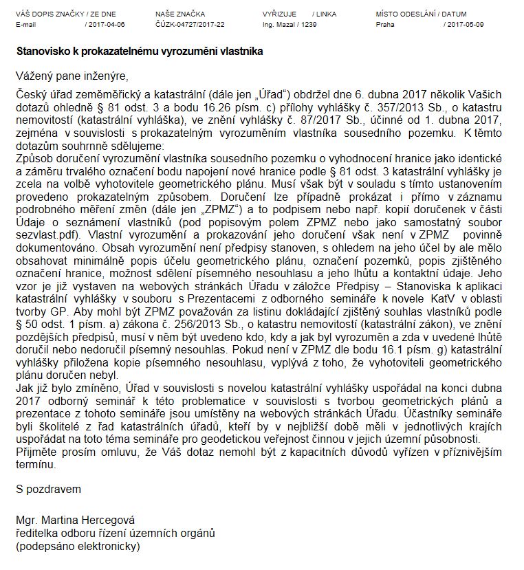 Zajímalo by mě tedy řešení u ostatních geodetů i jejich názor. A ještě poznámka: kopie dokladů o doručení není předepsanou náležitostí ZPMZ (viz stanovisko ČUZK).