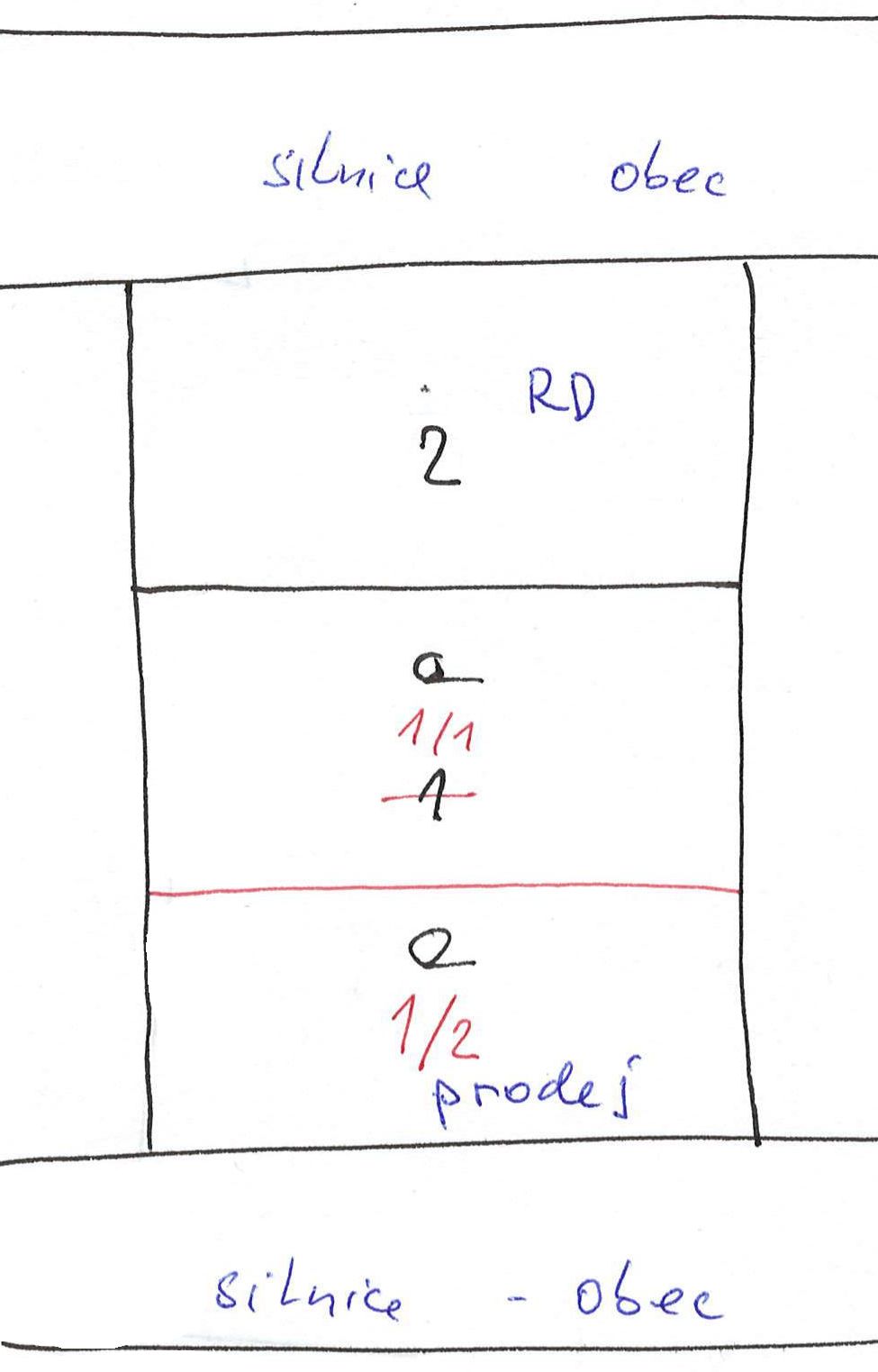 zákazník vlastní RD se zahradou mezi obecními komunikacemi (viz obrázek). Část zahrady parc.č. 1/2 chce prodat, RD parc.č. 2 a zahradu parc.č. 1/1 si chce ponechat.