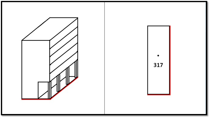 budova se v takovém případě zobrazuje průmětem, takže průnik s terénem se nevyznačuje. Pokud by pozemek pod „převislou částí“ byl jiného vlastníka, hranice pozemku by byla zobrazena jako shora neviditelná.