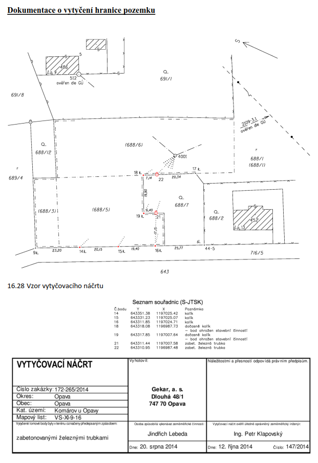 Dobrý den. Prosím o stanovisko. Vyhláška v příloze 16.28 uvádí vzor vytyčovacího náčrtu se seznamem souřadnic vytyčovaných bodů. Po vytyčení v KMD u bodů s KK8 jsou po transformaci na identické body souřadnice polohy do mezních odchylek odlišné od souřadnic obrazu. Jaké souřadnice se budou v náčrtu uvádět? Jen souřadnice polohy nebo také souřadnice obrazu? A budou se uvádět i KK vytyčených bodů?