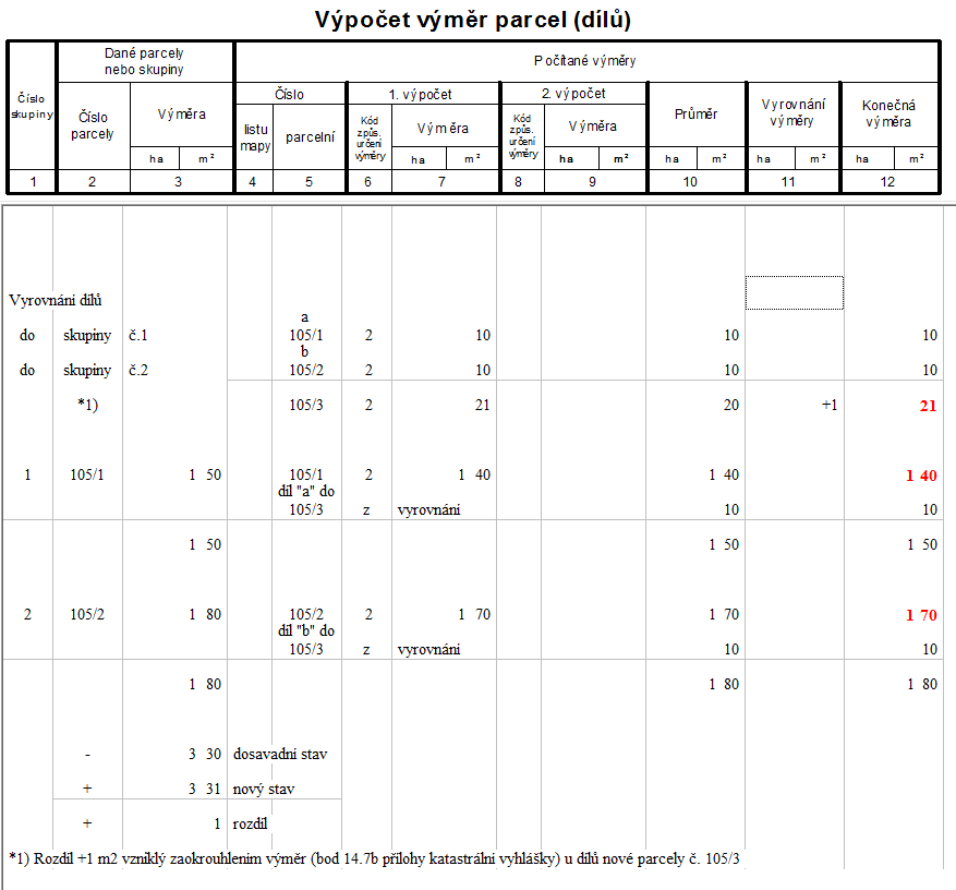 Podle vyhlášky 14.7.b) "se případný rozdíl mezi nově určenou výměrou a součtem jejích dílů poznamená v geometrickém plánu."