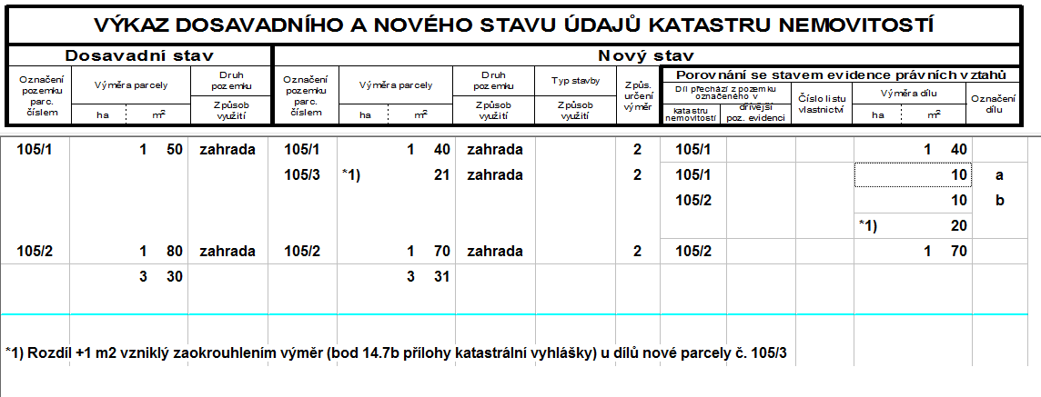 pokud jsou všechny díly určené číselně a také celková výměra je určena číselně, uvedu do nového stavu výměru celkovou a do porovnání vypočtené výměry dílů. K rozdílu uvedu poznámku, že je způsoben zaokrouhlováním (předpokládám, že jste myslel tento případ).