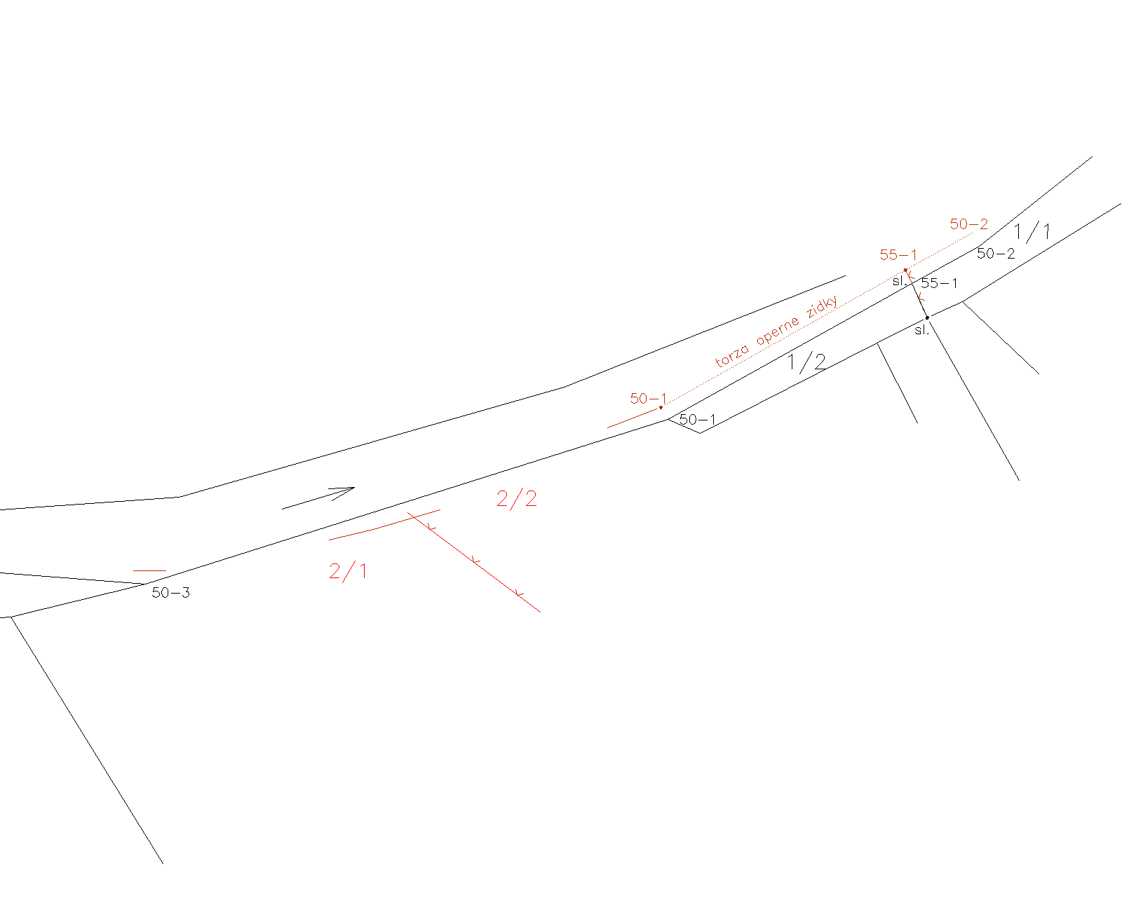 chtěl bych poprosit zdejší diskutující o radu/názor: dělím pozemek dle plotu na p.č. 2/1 a 2/2 (viz obr. červeně). Sousední pozemek byl dělen před dvěma lety (p.č. 1 -> 1/1 a 1/2). Při vkládání nového bodu 55-1 na tehdejší nové hranici mezi p.č. 1/1 a 1/2 došlo k zaměření/neprotokolárního vytyčení bodu 50-1 a 50-2, body dostaly v rámci ZPMZ 55 souřadnice polohy rozdílné od souřadnic obrazu. Ačkoli v náčrtu je bod 50-1 označen jako kolík, souřadnice polohy bodu vychází na kraj torza opěrné kamené zdíky potoka. Vytyčovatel to tam pravděpodobně posunul, asi protože to tak vycházelo i u ostaních bodů (neověřoval jsem - v náčrtu naznačeno tečkovaně). Nevím, jak jsou moc pro mne souřadnice zavázné. Nyní musím vytyčit bod 1 do stávající hranice mezi body 50-3 a 50-1. Nevím, jestli pro vytyčení nového vloženého bodu musím použít souřadnice polohy bodu 50-1 z přechozího ZPMZ nebo nemusím (při použití souř. polohy se dostávám do potoka). Torzo opěrné zídky (zaměřené hnědě plnou čarou) jako zřetelnou hranici použít nemohu, protože pohledově neodpovídá ....