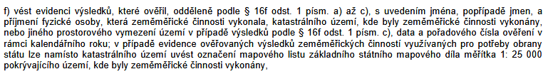 Dobrý den. Vrátím se k otázce evidence výsledků zeměměřické činnosti. Problematiku upravuje § 16 zeměměřického zákona odst. f). S kolegou si ustanovení vysvětlujeme každý jinak.