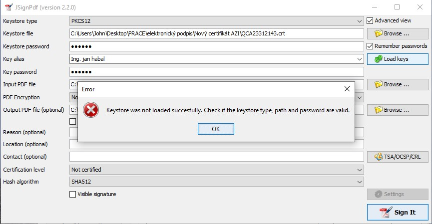 Tedy dotaz na kolegy zda někdo řešil nějaké nastavení programu JSign v.2.2. a mohl by mi prosím poradit zda a co je potřeba v programu změnit, když jsem si zažádal o obnovení certifikátu na token a zda se dá případně nějak vyrobit ten soubor .p12. PS: Také by mě dost zajímalo co je to vlastně keystore password v Jsign protože nastavený PIN tokenu to zřejmě není a nic jiného jsem nikde nenastavil....
