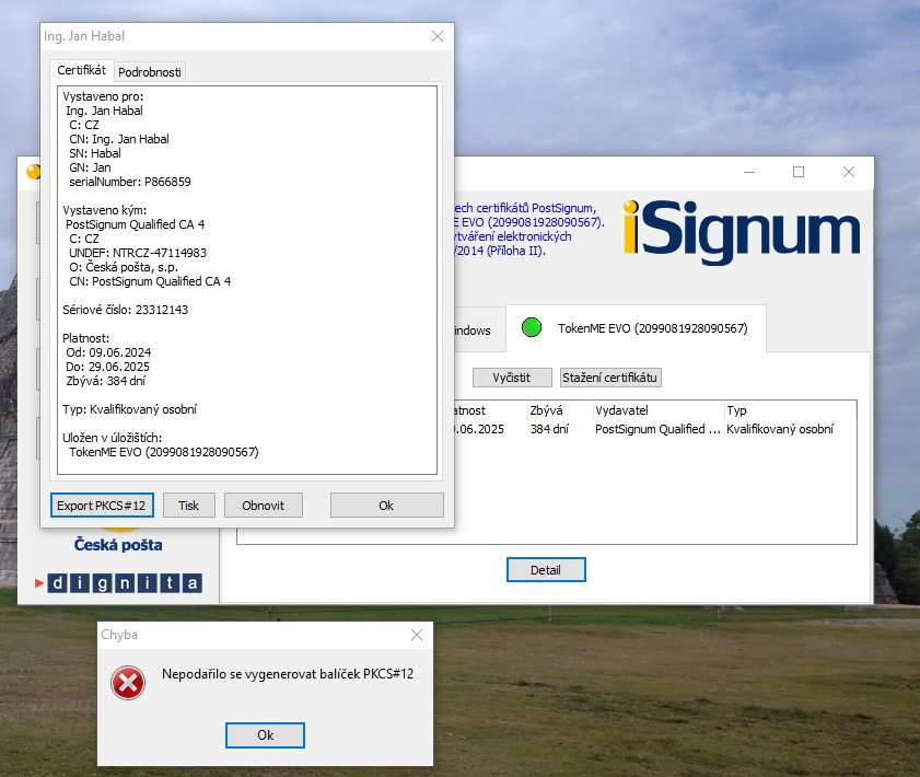 Ale nejsem si jistý zda je vše v pořádku v programu JSign v2.2. Je zde nutné něco měnit, aby program bral nový certifikát z Tokenu? Předpokládal jsem, že ano takže jsem do programu nastavil soubor nového certifikátu, ale ten mám pouze ve formátu .crt jak jsem ho obdržel od ČP. Aplikace iSignum u certifikátu na tokenu nechce udělat export souboru .p12. Což u toho původního certifikátu šlo... Více viz: