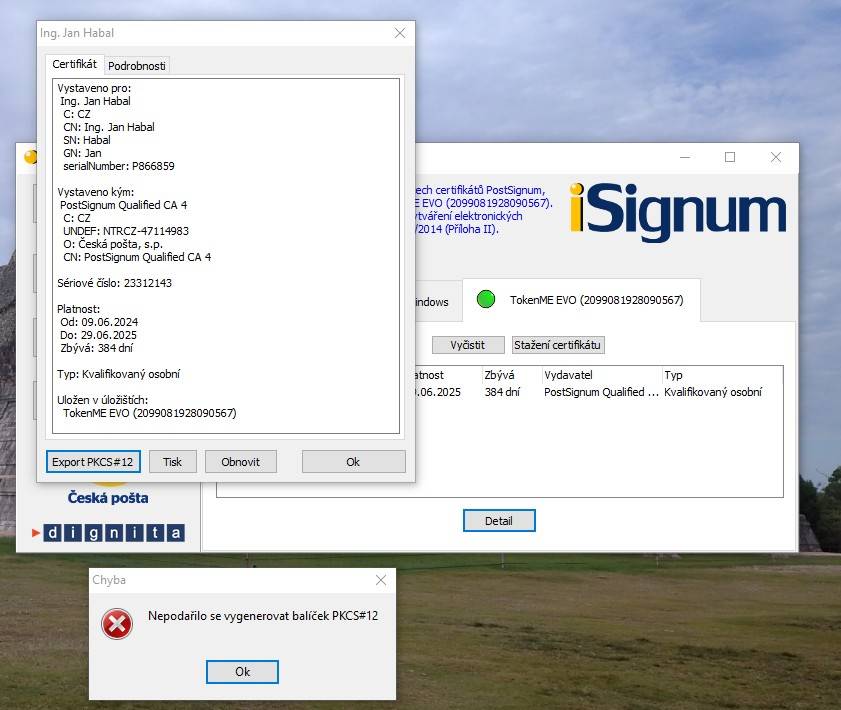 certifikátu na tokenu nechce udělat export souboru .p12. Což u toho