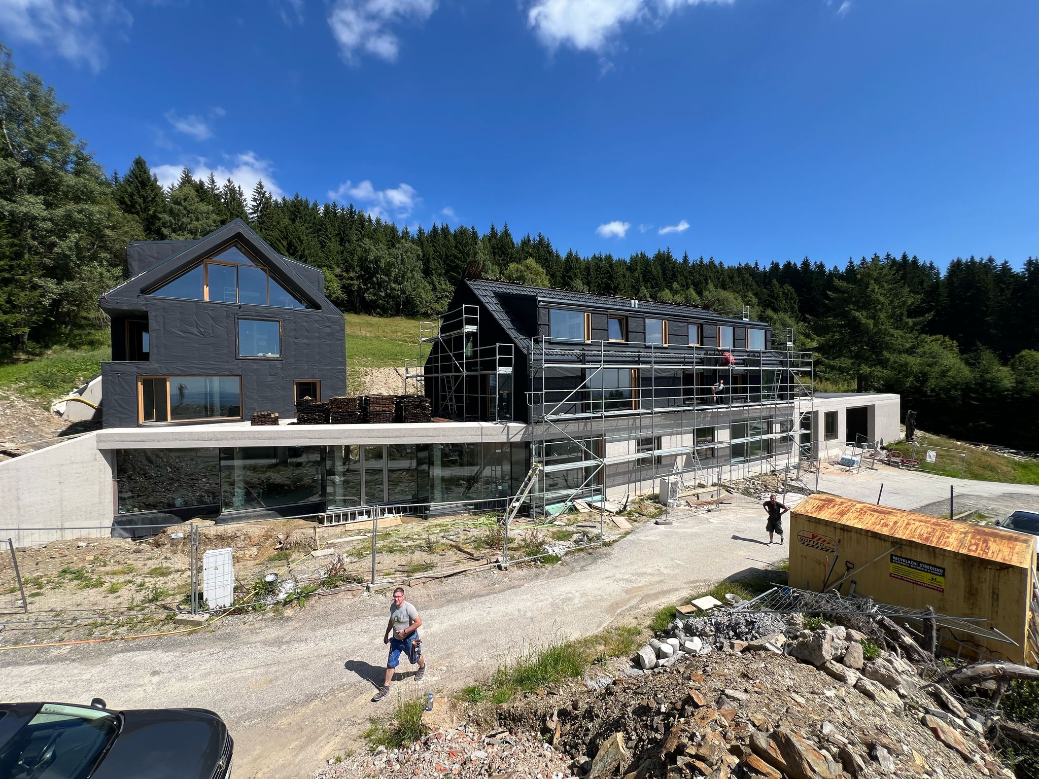jsou tři apartmánové domky (třetí je schovaný vzadu), prostor mezi nimi